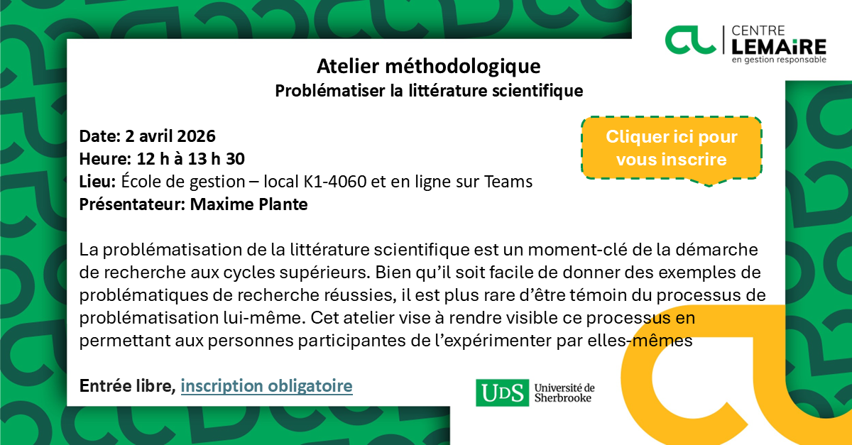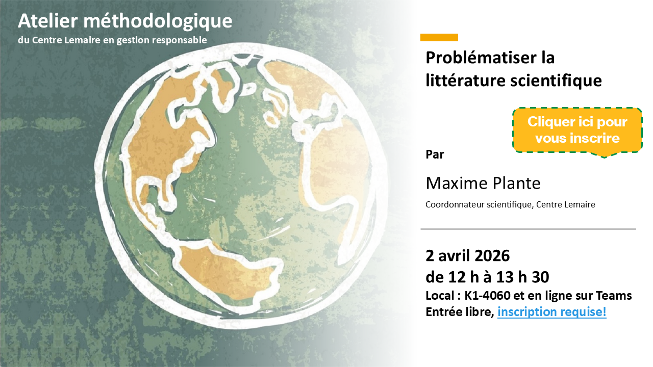 Le Centre Lemaire en gestion responsable vous invite très cordialement à son prochain atelier pratique, intitulé L’art de publier des recherches qualitatives, qui aura lieu le 22 octobre prochain.