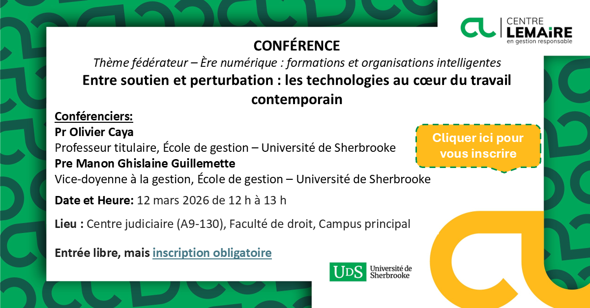 Le Centre Lemaire en gestion responsable vous invite chaleureusement à la conférence du Pr Pierre-Marc Leblanc (département de management), intitulée L’apprentissage comme levier d’efficacité des équipes de soins en contexte d’adversité, qui aura lieu le 3 décembre 2025, de 11h30 à 12h30.