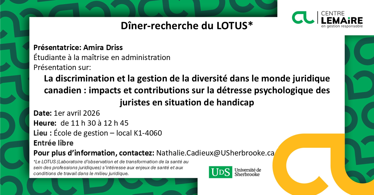 Le Centre Lemaire vous invite chaleureusement à participer à un dîner-recherche parrainé par le cabinet Normandin Beaudry le 23 octobre prochain. L’équipe LOTUS (Laboratoire d’observation et de transformation de la santé au sein des professions juridiques de l’UdeS) dirigée par la Pre Nathalie Cadieux présentera ses recherches passées et actuelles de concernant la santé et le mieux-être des professionnels du droit.